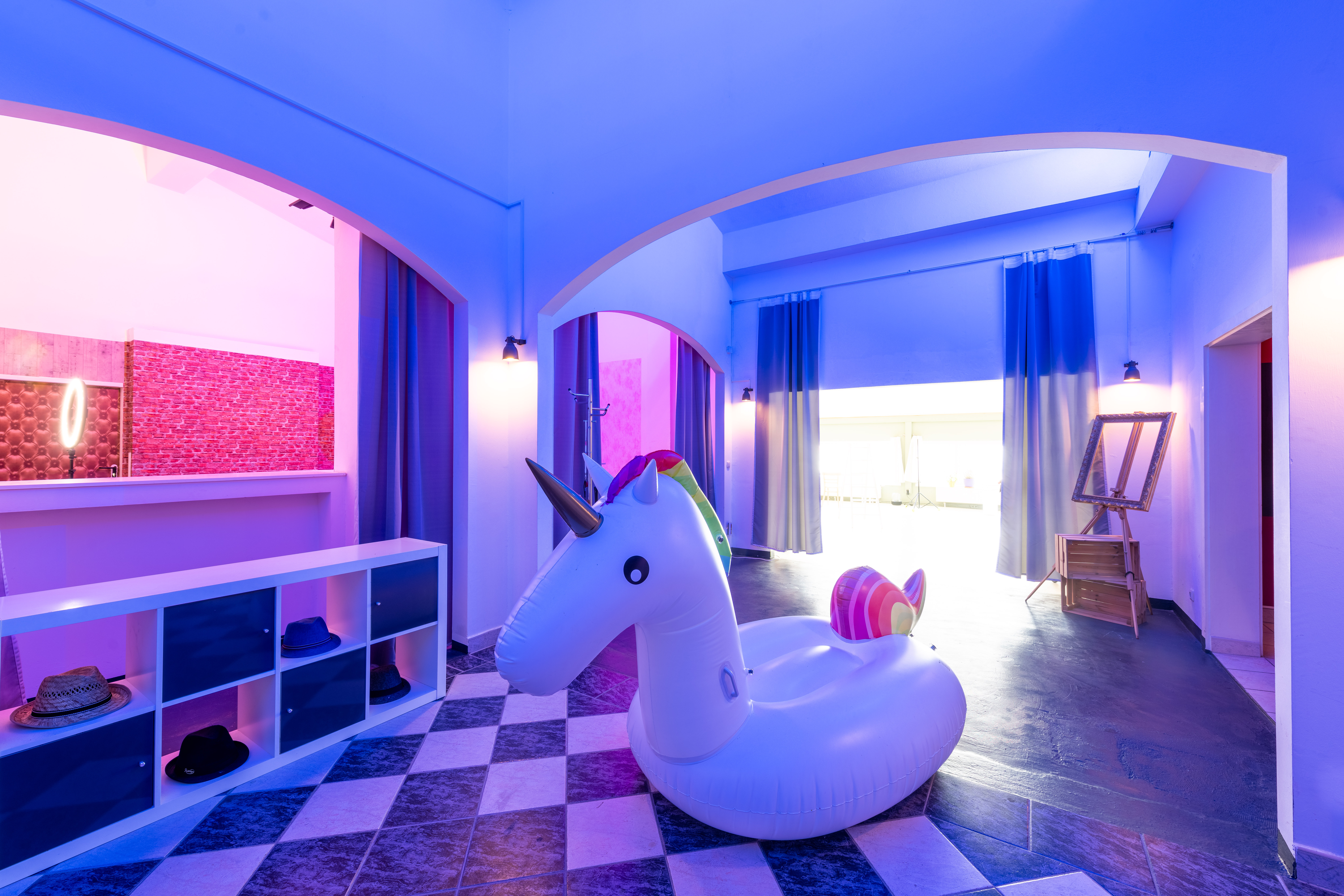 Wir verfügen über ein edles rotes Sofa für professionelle Fotos von Portrait bis Akt. In unserer Styling-Lounge können Sie sich selbst stylen oder von unseren Profis stylen lassen. In unserer Fun-Area gibt es ein großes Einhorn, ein Trampolin, überdimensional große Absatzschuhe, Ledersofas und auch ein großes Bett für wilde Kissenschlachten für ein ausgefallenes Fotoshooting.